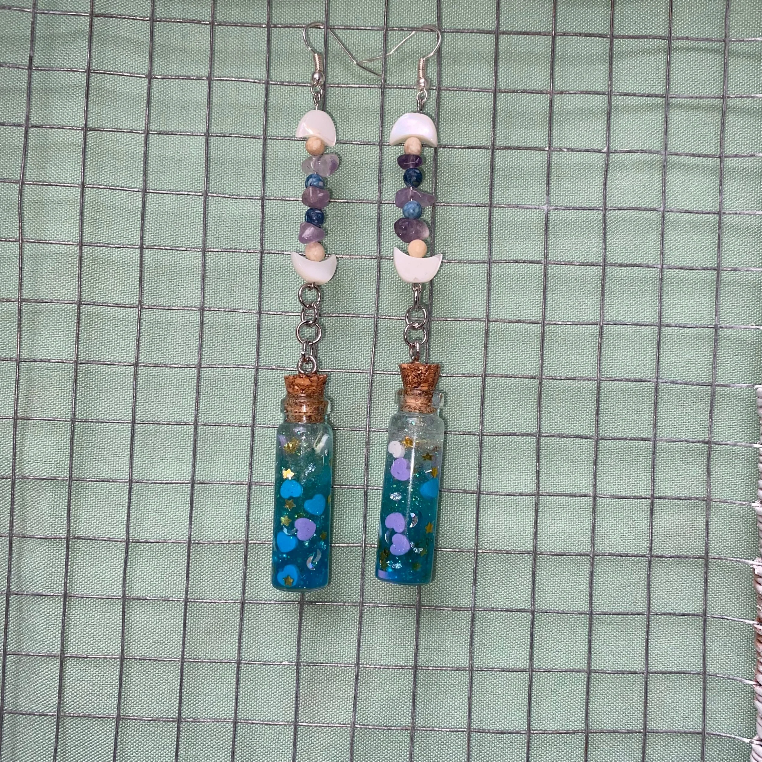 Shop › Blue Dreams Potion Earrings Image 1 of 1 Blue Dreams Potion Earrings Sale Price: $20.00 Original Price: $25.00 Hand made, glow in the dark potion bottles. Includes amethyst and half-moon shell earrings. Quantity: Add To Cart Added! Hand made, glow in the dark potion bottles. Includes amethyst and half-moon shell earrings.